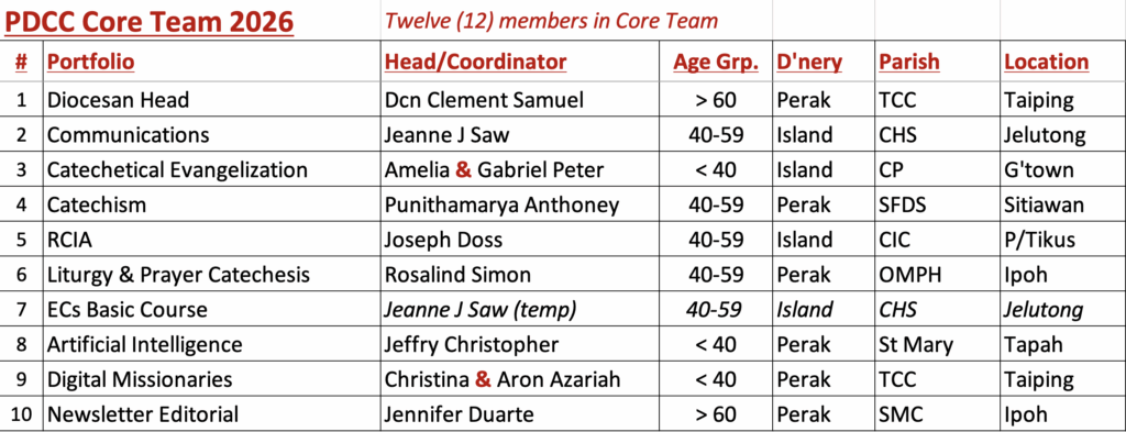 PDCC is the official body that oversee the development of Catechesis in the Diocese of Penang, Malaysia.